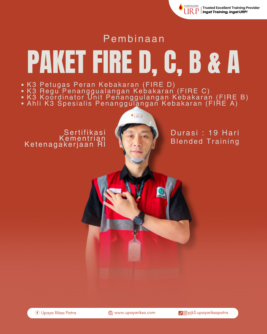 Paket Pembinaan FIRE D, C, B, A ini ditujukan bagi Petugas yang telah ditunjuk mengidentifikasi sumber-sumber bahaya dan melaksanakan upaya-upaya penanggulangan kebakaran. Satuan tugas khusus yang mempunyai tugas manajerial di bidang penanggulangan kebakaran, di selenggarakan berdasarkan Keputusan Menteri Tenaga Kerja RI No. Kep. 186/MEN/1999 tentang Unit Penanggulangan Kebakaran di Tempat Kerja.